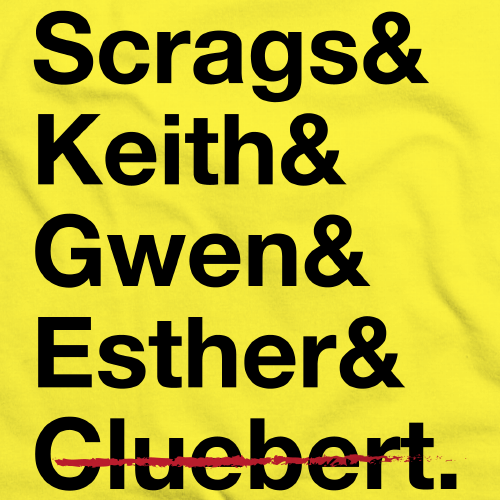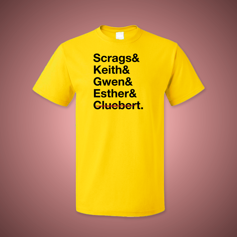 A t-shirt featuring the names of most of your favorite kid detectives (RIP Cluebert)